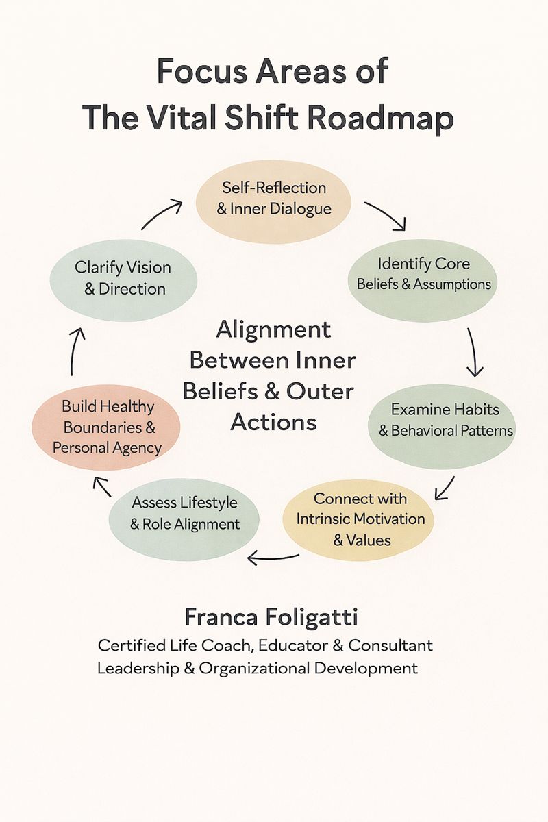 Over time, my work evolved into what I call the Vital Shift Roadmap for Growth — a developmental framework designed to support clarity, alignment, and sustainable growth across personal, professional, and organizational contexts.